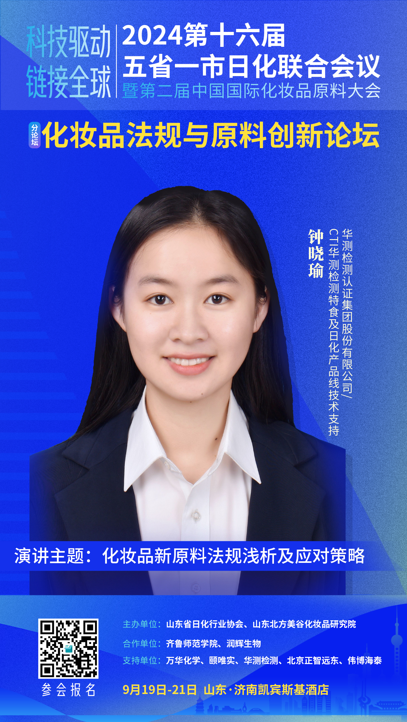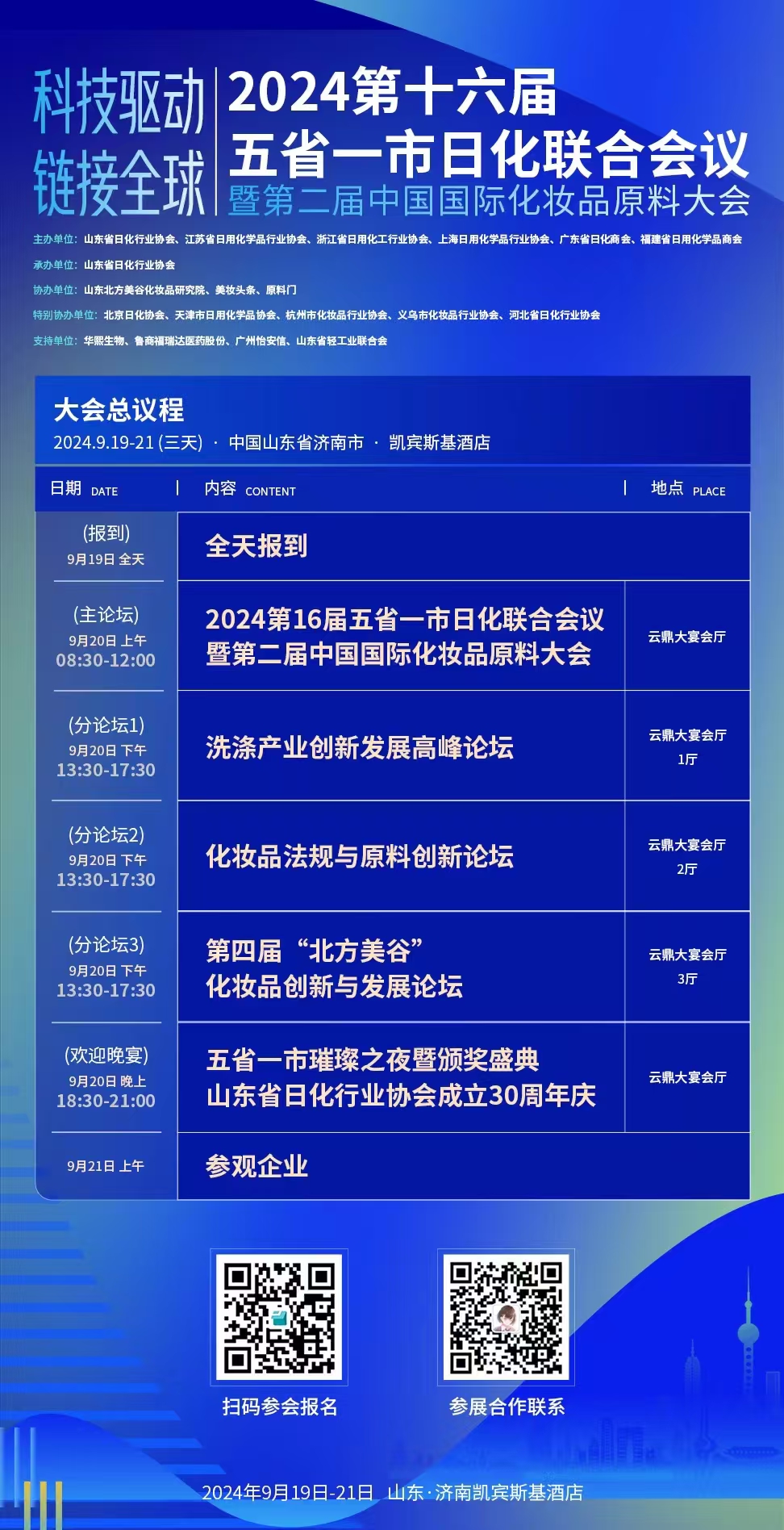 2024年9月19-21日,第16届五省一市日化团结聚会暨第二届中国国际化妆品质料大会将在山东济南凯宾斯基旅馆举行。
