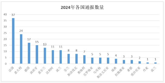 ¡¡¡¡×ª´ï¹ú£º2024Äêת´ïµÄ180ÆðÎ¥¹æ²úÆ·ÖУ¬·¨¹úת´ïÁË37Æð£¬Òâ´óÀûת´ï24Æð£¬µÂ¹ú17Æð£¬Î÷°àÑÀ15Æð£¬°®¶ûÀ¼13Æð£¬±ÈÀûʱ11Æð£¬²¨À¼11Æð£¬ÆäËû¼ûÏÂͼ¡£