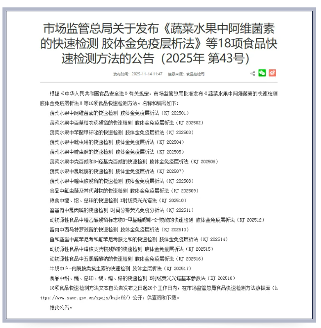 11ÔÂ14ÈÕ£¬Êг¡î¿Ïµ×ܾÖÅú×¼Ðû²¼18ÏîʳÎï¿ìËÙ¼ì²âÒªÁ죬ÁýÕÖÊß²ËË®¹ûũҩ²ÐÁô¡¢Á¸Ê³ÖؽðÊô¡¢ÐóÇÝÈâÊÞÒ©²ÐÁô¡¢ÈéÖÆÆ·Çå¾²µÈÁìÓò£¬È«·½Î»ÖþÀÎʳÎïÇå¾²“·À»ðǽ”£¬ÈÃʳÎïΣº¦É¸²é¸ü¸ßЧ¡¢¸ü¾«×¼¡£
