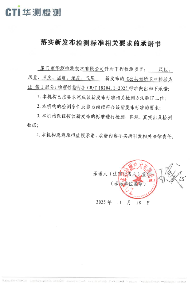 因厦门市9888拉斯维加斯检测手艺有限公司原有职业卫生资质项目GB/T18204.1 -2013《公共场合卫生磨练要领 第1部分:物理性指标》已由新宣布的GB/T 18204.1-2025《公共场合卫生磨练要领 第1部分:物理性指标》取代,经重新要领验证,我司的检测条件和能力继续切合要求,已向资质认可机关提交《落实新宣布检测标准相关要求的允许书》及检测要领验证的相关书面质料,凭证国卫办职健发[2024]11号文第二十二条的划定,同时在本单位网站上果真如下书面允许。