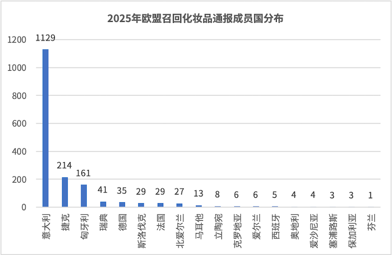 ¡¡¡¡2025Äê  £¬EU RAPEX¹²Ðû²¼ÁË1718Àý»¯×±Æ·×ª´ï  £¬ÕâЩת´ï»®·ÖÌá½»×ÔÒâ´óÀû¡¢½Ý¿Ë¡¢ÐÙÑÀÀû¡¢ÈðµäµÈ18¸ö¹ú¼Ò  £¬ÆäÖÐת´ï´ÎÊý×î¶àÊÇÒâ´óÀû  £¬¸ß´ï1129´Î  £¬Æä´ÎÊǽݿË  £¬´ï214´Î ¡£×ª´ï¹ú¼°Æä¶ÔÓ¦»¯×±Æ·×ª´ïÀýÊýÈçÏÂͼËùʾ ¡£