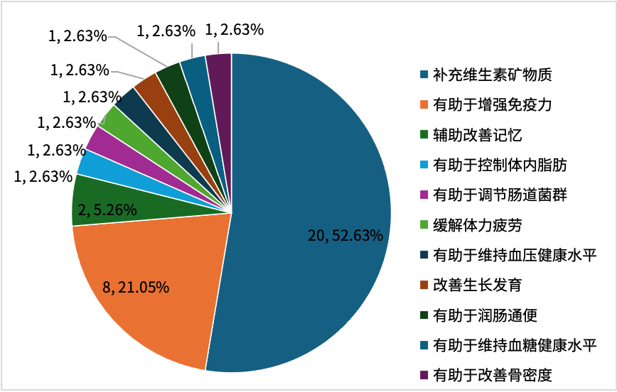 ¡¡¡¡´Óȱ·¦¸ñ±£½¡Ê³ÎïµÄ¹¦Ð§ÖÖ±ðÆÊÎö£¬Èçͼ1Ëùʾ£¬36¿îȱ·¦¸ñ²úÆ·¹²ÓÐ11ÖÖ¹¦Ð§ÖÖ±ðÐû³Æ£¬»®·ÖÊÇÔö²¹Î¬ÉúËØ¿óÎïÖÊ¡¢ÓÐÖúÓÚÔöÇ¿ÃâÒßÁ¦¡¢¸¨Öú¸ÄÉÆÓ°Ïó¡¢ÓÐÖúÓÚ¿ØÖÆÌåÄÚÖ¬·¾¡¢ÓÐÖúÓÚµ÷Àí³¦µÀ¾úȺ¡¢»º½âÌåÁ¦Æ£ÀÍ¡¢ÓÐÖúÓÚά³ÖѪѹ¿µ½¡Ë®Æ½¡¢¸ÄÉÆÉú³¤·¢Óý¡¢ÓÐÖúÓÚÈó³¦Í¨±ã¡¢ÓÐÖúÓÚά³ÖѪÌÇ¿µ½¡Ë®Æ½¡¢ÓÐÖúÓÚ¸ÄÉÆ¹ÇÃܶÈ¡£È±·¦¸ñÂʽϸߵĹ¦Ð§ÖÖ±ð²úÆ·ÒÔÔö²¹Î¬ÉúËØ¿óÎïÖÊΪÖ÷£¬Õ¼±ÈΪ52.63%£¨20¿î£©£¬Æä´ÎÊÇÓÐÖúÓÚÔöÇ¿ÃâÒßÁ¦£¨8¿î£¬21.05%£©£¬¸¨Öú¸ÄÉÆÓ°Ïó£¨2¿î£¬5.26%£©£¬ÓÐÖúÓÚ¿ØÖÆÌåÄÚÖ¬·¾¡¢ÓÐÖúÓÚµ÷Àí³¦µÀ¾úȺ¡¢»º½âÌåÁ¦Æ£ÀÍ¡¢ÓÐÖúÓÚά³ÖѪѹ¿µ½¡Ë®Æ½¡¢¸ÄÉÆÉú³¤·¢Óý¡¢ÓÐÖúÓÚÈó³¦Í¨±ã¡¢ÓÐÖúÓÚά³ÖѪÌÇ¿µ½¡Ë®Æ½¡¢ÓÐÖúÓÚ¸ÄÉÆ¹ÇÃܶȾùÖ»ÓÐ1¿îȱ·¦¸ñ£¨2.63%£©¡£ÆäÖУ¬¸ÄÉÆÉú³¤·¢Óý¹¦Ð§ÓÚ2023ÄêÐû²¼µÄÎļþ¡¶±£½¡Ê³ÎïÉù³ÆµÄ±£½¡¹¦Ð§Ä¿Â¼·ÇÓªÑøËØÔö²¹¼Á£¨2023Äê°æ£©¡·ÖÐÒѾÙÐÐɾ³ý¡£ÔÚ20¿îÔö²¹Î¬ÉúËØ¿óÎïÖÊÀàµÄ±£½¡Ê³ÎïÖУ¬ÓÐ8¿îÐû³ÆÔö²¹µ¥¸öάÉúËØ»ò¿óÎïÖÊ¡¢12¿îÊÇÔö²¹Á½ÖÖ»òÁ½ÖÖÒÔÉÏάÉúËØºÍ£¨»ò£©¿óÎïÖʵı£½¡¹¦Ð§¡£
