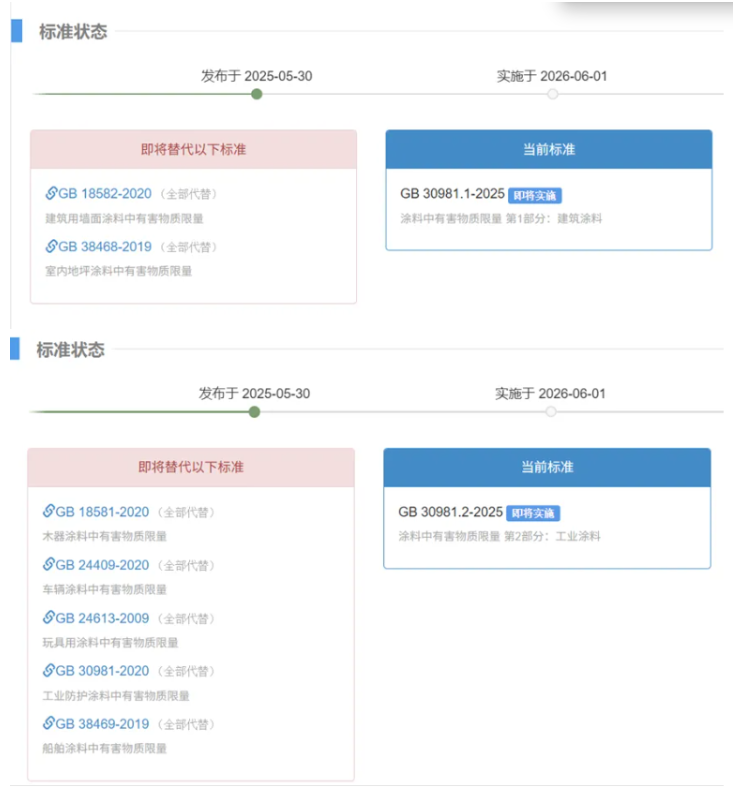 2025Äê5ÔÂ30ÈÕ£¬GB 30981.1-2025¡¶Í¿ÁÏÖÐÓк¦ÎïÖÊÏÞÁ¿µÚ1²¿·Ö£ºÐÞ½¨Í¿ÁÏ¡·ºÍGB 30981.2-2025¡¶Í¿ÁÏÖÐÓк¦ÎïÖÊÏÞÁ¿µÚ2²¿·Ö£º¹¤ÒµÍ¿ÁÏ¡·Ðû²¼£¬²¢½«ÓÚ2026Äê6ÔÂ1ÈÕʵÑ飬GB 30981.1-2025Ìæ»»GB 18582—2020ºÍGB 38468—2019£¬GB 30981.2-2025Ìæ»»GB 30981—2020¡¢GB 18581—2020¡¢GB 24409—2020¡¢GB 24613—2009¡¢GB 38469—2019£¬±ê×¼Îı¾½«ÓÚ±ê×¼Ðû²¼ºó20¸öÊÂÇéÈÕÄÚ¹ûÕæ¡£