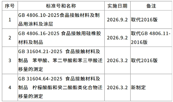 2025Äê9ÔÂ25ÈÕ£¬¹ú¼ÒÎÀ½¡Î¯Ðû²¼ÁË32ÏîÐÂʳÎïÇå¾²¹ú¼Ò±ê×¼ºÍ2ÏîÐ޸ĵ¥£¬ÆäÖÐÓëʳÎï½Ó´¥ÖÊÁÏÏà¹ØµÄ±ê×¼ÓÐ4¸ö£¬°üÀ¨Í¿²ãGB 4806.10-2025£¬¹èÏ𽺣¨¹è½º£©GB 4806.16-2025£¬ÒÔ¼°Á½¸ö²âÊÔÒªÁìGB 31604.21-2025(±½¼×Ëá¡¢±½¶þ¼×ËáºÍ±½Èý¼×ËáǨáãÁ¿)¡¢GB 31604.64-2025£¨ÄûÃÊËáõ¥ºÍ¹ï¶þËáõ¥À໯ºÏÎïǨáãÁ¿£©¡£