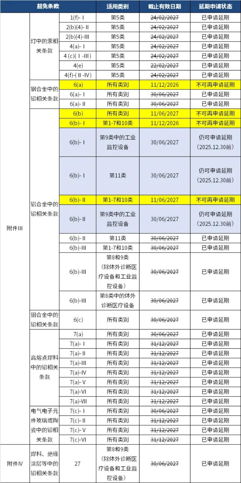 2025Äê12ÔÂ19ÈÕ£¬Å·ÃËÐû²¼×îÐÂRoHS¿íÃâÇåµ¥£¨Exemptions list-validity and rolling plan Dec 2025£©£¬¸üÐÂÁË´ó×Ú¿íÃâÌõ¿îµÄÑÓÆÚÉêÇë״̬£¬ÖµµÃ¹Ø×¢µÄÊÇ£¬11Ô¸ոոüÐÂÁË¿íÃâÓÐÓÃÆÚµÄ¸Ö/ÂÁ/ͺϽ𡢸ßÈ۵㺸ÁÏ¡¢µçÆøµç×ÓÔª¼þ²£Á§»òÌÕ´ÉÖеÄǦµÈ¸ßƵʹÓÿíÃâÌõ¿î£¨Ïê¼û“ÖØ°õ£¡Å·ÃËÕýʽ¸üжàÏîRoHSǦÏà¹Ø¿íÃâÌõ¿î”£©£¬¾ùÓÐÀûÒæÏà¹Ø·½Ìá½»ÑÓÆÚÉêÇë¡£