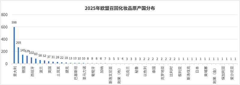 ¡¡¡¡2025Äê  £¬EU RAPEX¹²Ðû²¼ÁË1718Àý»¯×±Æ·×ª´ï  £¬ÕâЩת´ï»®·ÖÌá½»×ÔÒâ´óÀû¡¢½Ý¿Ë¡¢ÐÙÑÀÀû¡¢ÈðµäµÈ18¸ö¹ú¼Ò  £¬ÆäÖÐת´ï´ÎÊý×î¶àÊÇÒâ´óÀû  £¬¸ß´ï1129´Î  £¬Æä´ÎÊǽݿË  £¬´ï214´Î ¡£×ª´ï¹ú¼°Æä¶ÔÓ¦»¯×±Æ·×ª´ïÀýÊýÈçÏÂͼËùʾ ¡£
