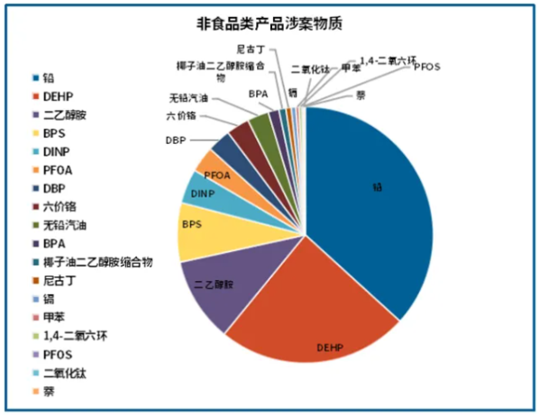 ¡¡¡¡2025ÄêÊý¾ÝÏÔʾ·ÇʳÎïÀà²úÆ·Éæ°¸ÎïÖÊÈçÏ£¬ÆäÖÐÇ¦Éæ¼°°¸Àý×î¶à£¬Õ¼±ÈΪ38.4%£¬ÁÚ±½ÎïÖÊ£¨DEHP¡¢DINP¡¢DBP£©Õ¼±ÈΪ31%£¬¶þÒÒ´¼°·¡¢Ò¬×ÓÓͶþÒÒ´¼°·ËõºÏÎï¡¢1,4-¶þÑõÁù»·¡¢¶þÑõ»¯îÑ£¨¿ÉÎüÈ룩ËÄÏîÎïÖÊÉæ°¸Õ¼±ÈΪ13%£¬Ë«·ÓSÕ¼±ÈΪ7.8%£¬PFOAÉæ°¸Õ¼±ÈΪ3% ¡£¹ØÓÚPFOA°¸Àý˵Ã÷£º2025Äê¹ØÓÚPFOAµÄ°¸ÀýÉæ¼°É¡¡¢±³°ü¡¢ÕíÍ·¡¢³èÎï´²¡¢¿ã×Ó¡¢ÓêÒ¡¢Ô¡Á±¡¢×À²¼¡¢Ö½Îü¹ÜµÈ£¬½ÏÍùÄêͬÆÚÏà±È°¸ÀýÊýÄ¿¼°Éæ°¸²úÆ·ÀàÐÍÓÐËùÔö¶à£¬Ïà¹ØÆóÒµÐèÖØµã¹Ø×¢ ¡£